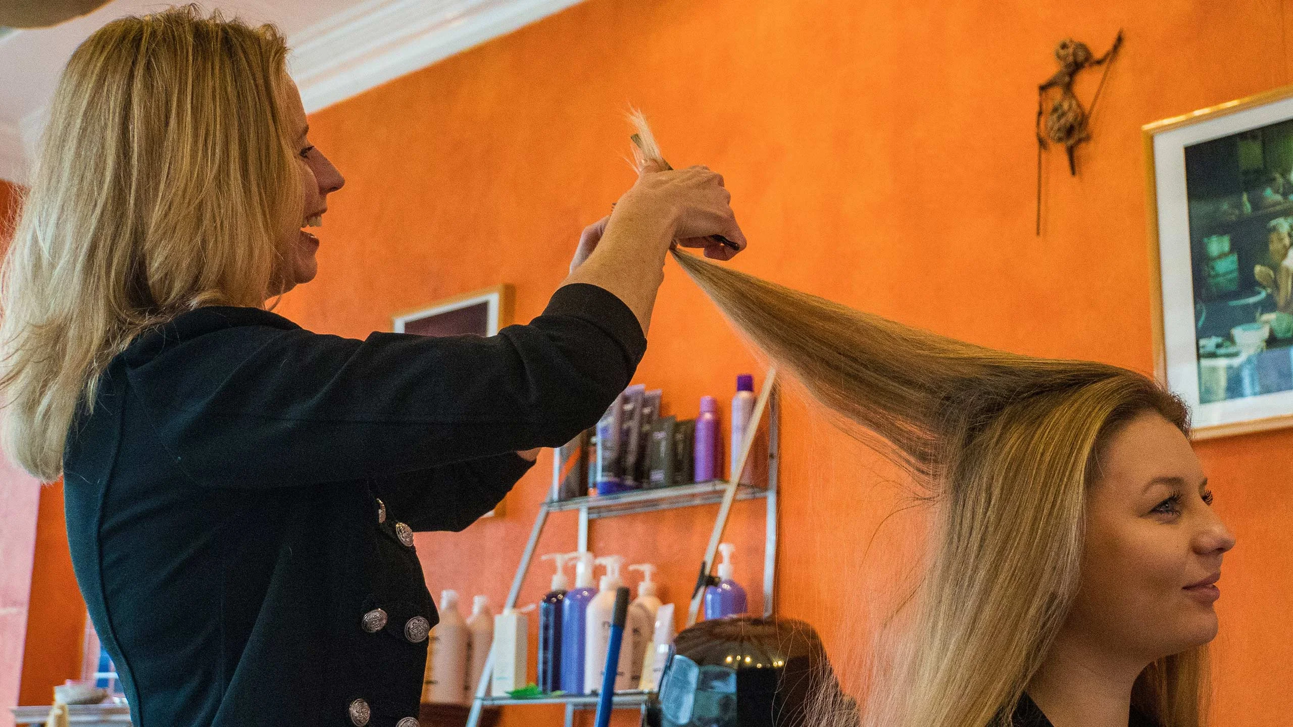 Karin’s ‘signatuur-techniek’ is haar snijden: op lengte maken en in model brengen met het mes, in plaats van met de schaar. Deze techniek zorgt voor natuurlijk vallend haar.